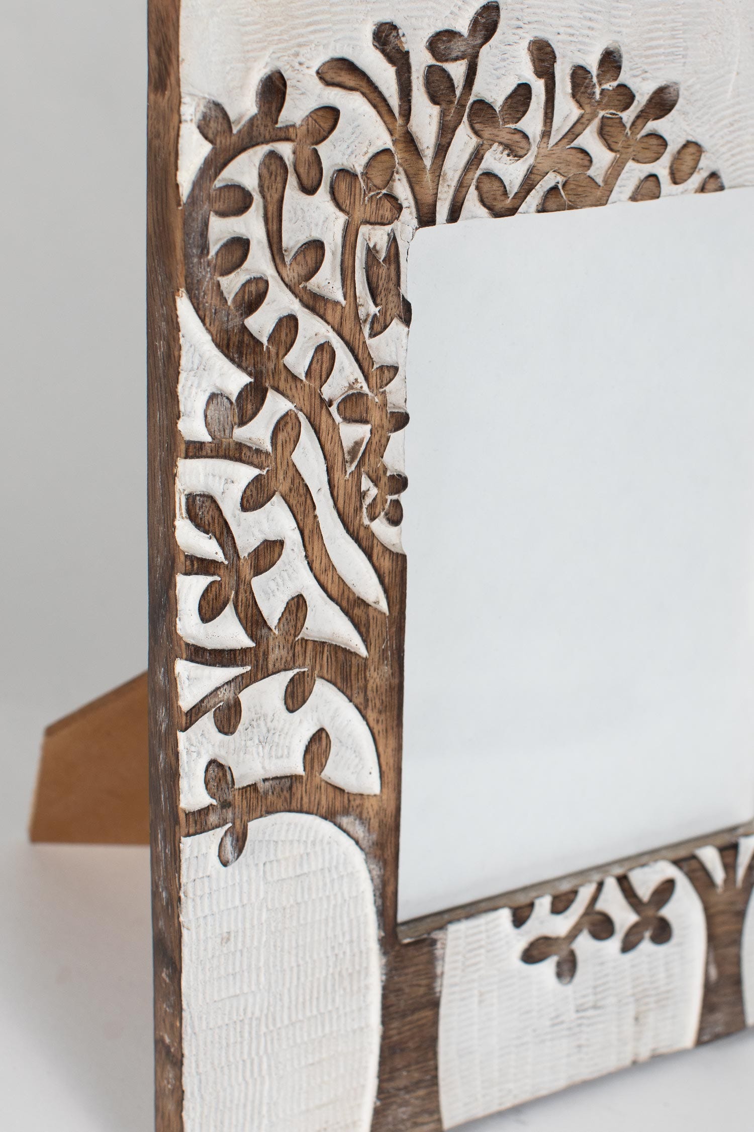 Handcarved by fair trade artisans in India from sustainable mango wood, the 5x7 Mango Wood Tree Frame features two carved trees on a whitewashed background. Fits a 5x7 photo and can be featured on a tabletop or hung on the wall.
