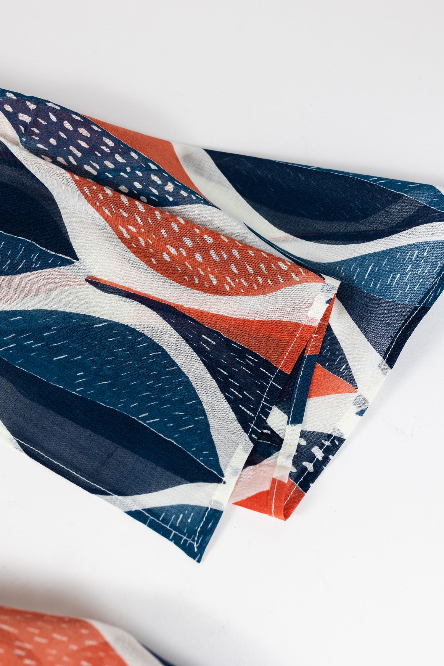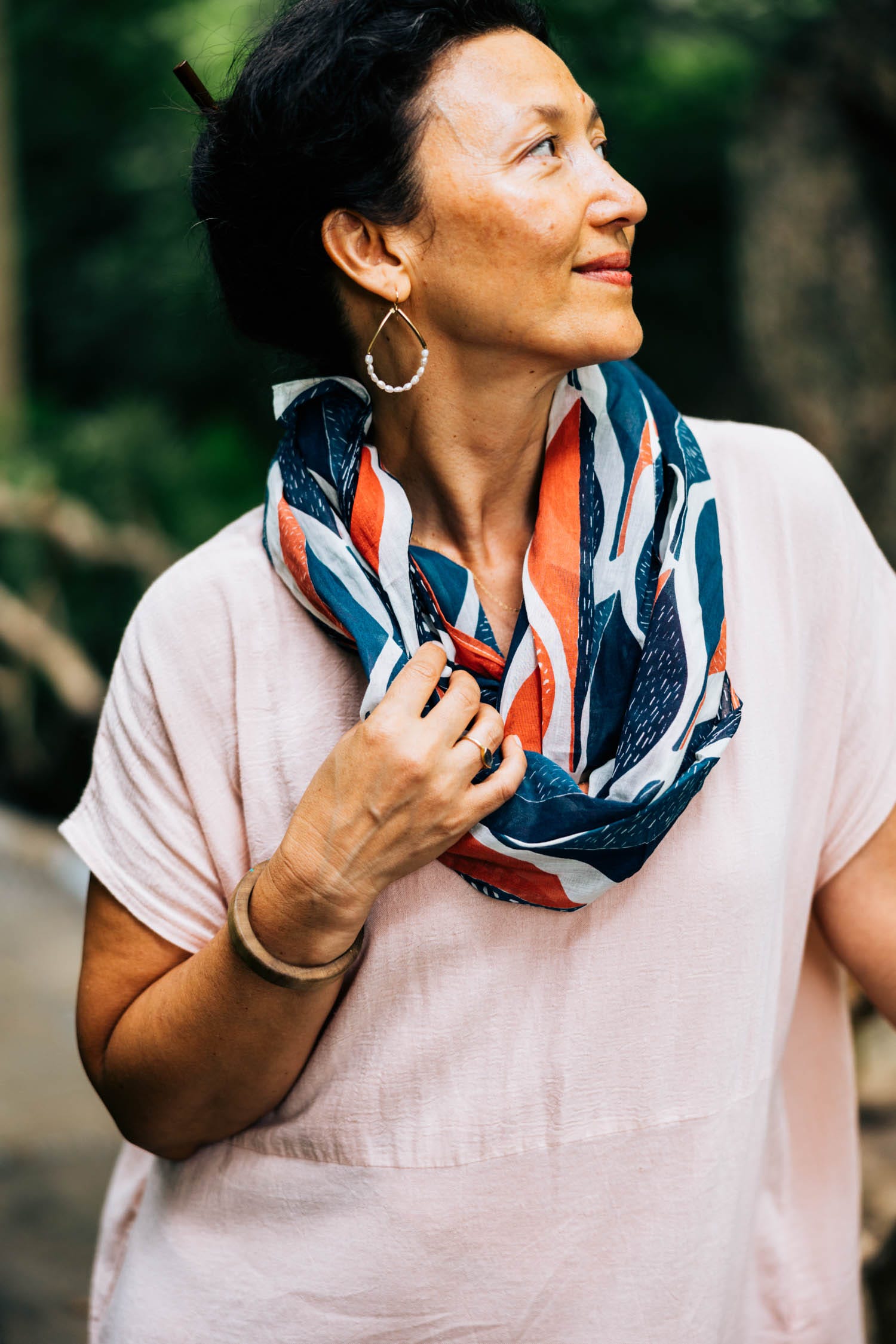 Made of mul mul cotton, a heavy-weight muslin from the textile capital of the world, India, the Autumn Midnight Scarf is the perfect pop of color in your wardrobe in tones of rust, navy and cadet blue. Lightweight and flowy, adding this accessory on a spring or fall day makes you ready for any temperature flux.