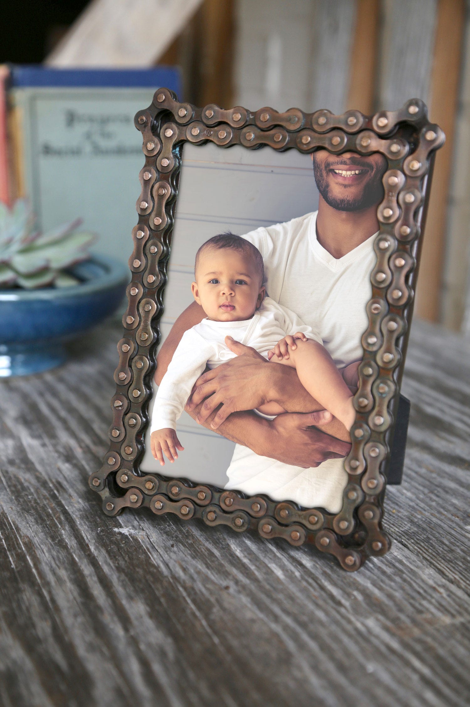 Perfect gift for your favorite cyclist or recyclist! Recycled bicycle chain makes a unique picture frame. In dark brown.