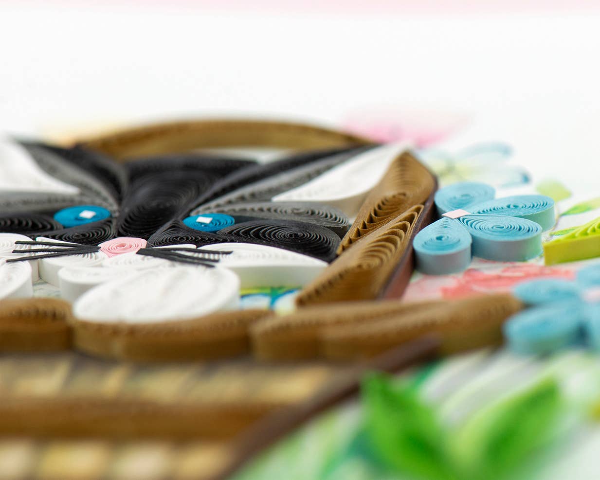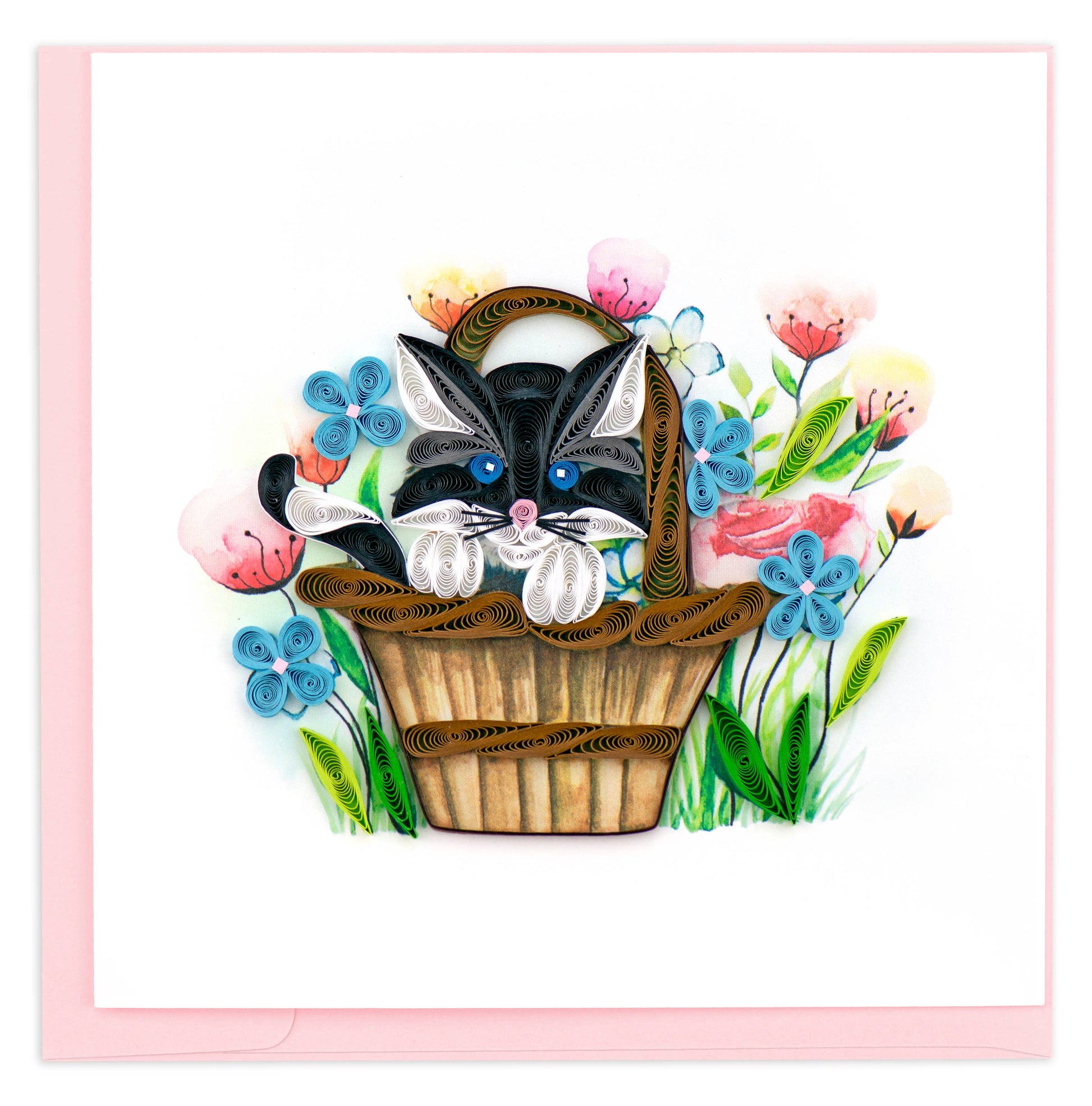 Celebrate the addition of a new companion with our adorable Quilled Black Kitten card. This handcrafted design shows a little black kitten in a basket with green and pink plants in the background.