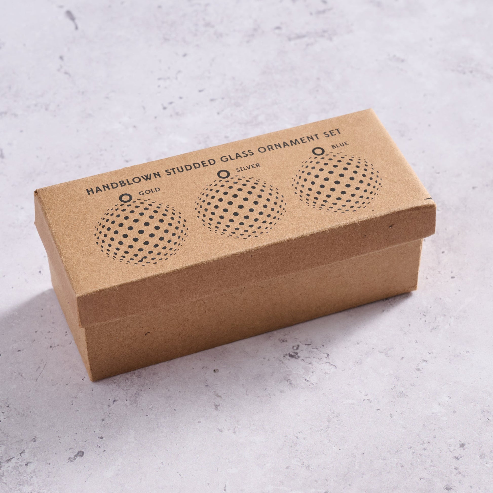 Add eye-catching flair to your holiday decor with this set of three glass ball ornaments! Hand-blown by artisans in India, each ornament in this set is infused with different color dots, including silver, gold and a gorgeous blue. Hang them from the tree using the included ribbon or display them in another special spot around the home. Giftable box included. a Ten Thousand Villages Exclusive Handcrafted by our fair trade partner Tara Projects, which helps to transform artisans' lives and communities with new opportunities to earn sustainable income.