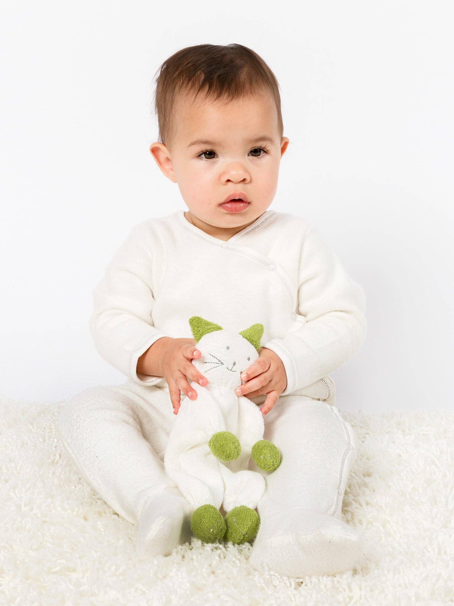 The perfect companion and a great baby gift, the soft flat toy cat is easy for little hands to hold. The head and hands and feet are stuffed with organic cotton for little fingers. This soft and eco-friendly organic cotton toy has been lovingly crafted in a Certified Fair Trade facility without the use of pesticides or chemicals and is made and stuffed with 100% GOTS certified organic Egyptian Cotton. * Ages: Suitable for all ages 0+ *Measures 9" tall