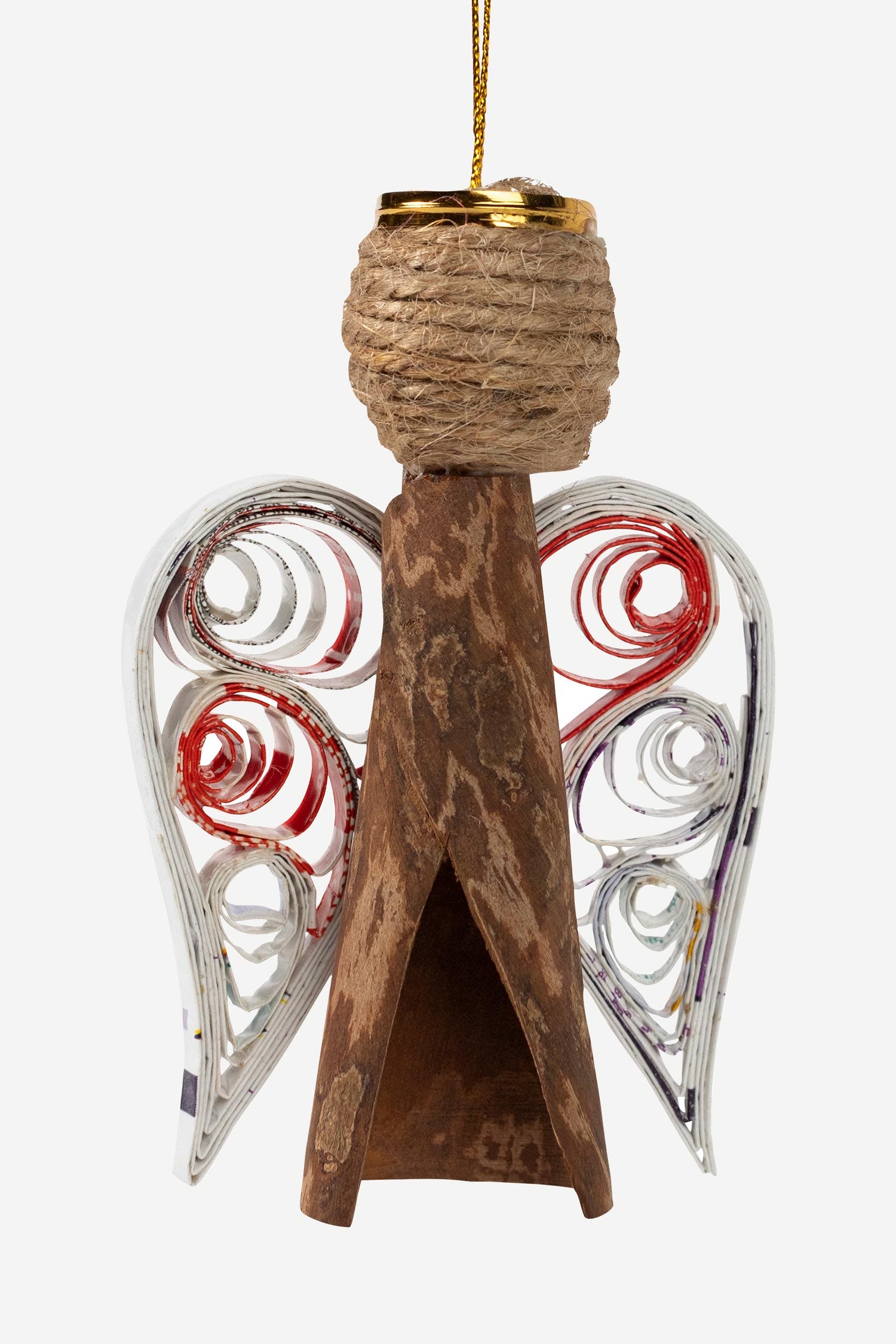 The Cinnamon Angel Ornament is a creative compilation of sustainable and natural materials. The body is made from cinnamon bark, which smells wonderfully warm and festive; the head is made from a wooden sphere wrapped in natural jute twine and the wings are made from recycled quilled paper, expertly scrolled and shaped. If you're looking for ethically made, sustainable Christmas ornaments, you've found a match!