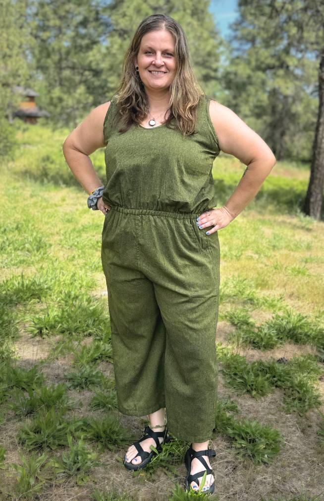 Lightweight v neck sleeveless cotton romper/jump suit with elastic waist and 3/4 length leg. Plus it has pockets! This is the most comfortable and flattering one-stop outfit. Great for spring and summer, add a shawl to transition to fall.