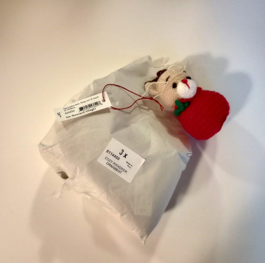 Reindeer in a bag-oh, cute! Sweet and handmade-sounds like the holidays. Hang this cozy crocheted ornament on your tree for a traditional red and green-themed decor. Handcrafted by artisans in Peru with Manos Amigas, meaning "hands joined in friendship" in Spanish.