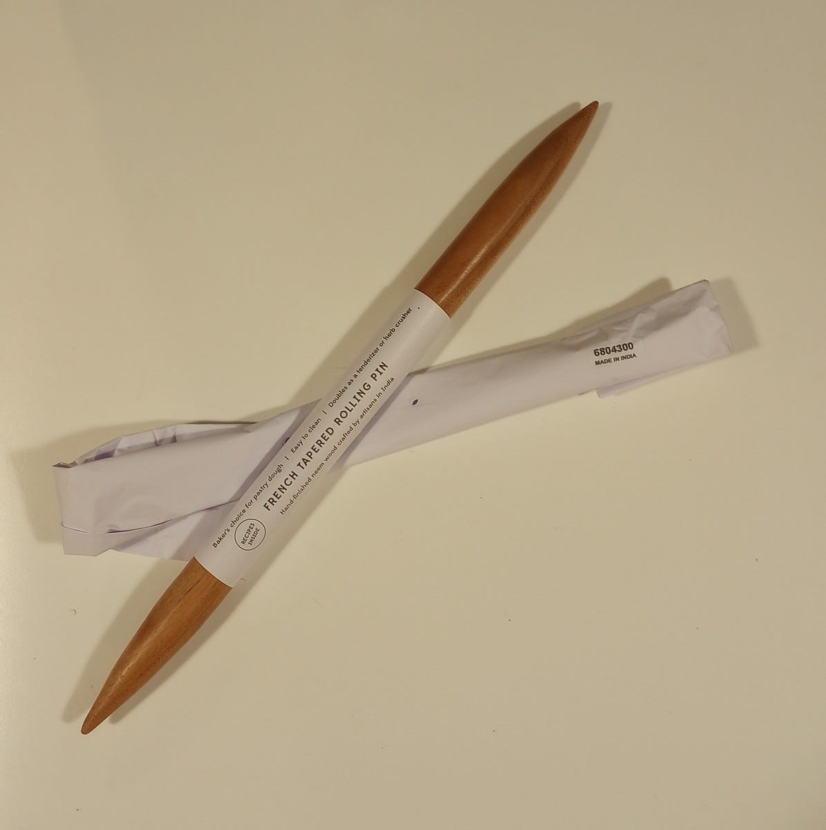 The French Tapered Rolling Pin is one of the most used tools by professional bakers. Most find it works much better than the traditional handled pin because of its simple design. There are no bulky handles keeping you from the feel of your dough, no screws in the construction to inevitably rust out, and the tapered ends allow for ease of mobility. This one has been handcrafted by fair trade wood workers in India.