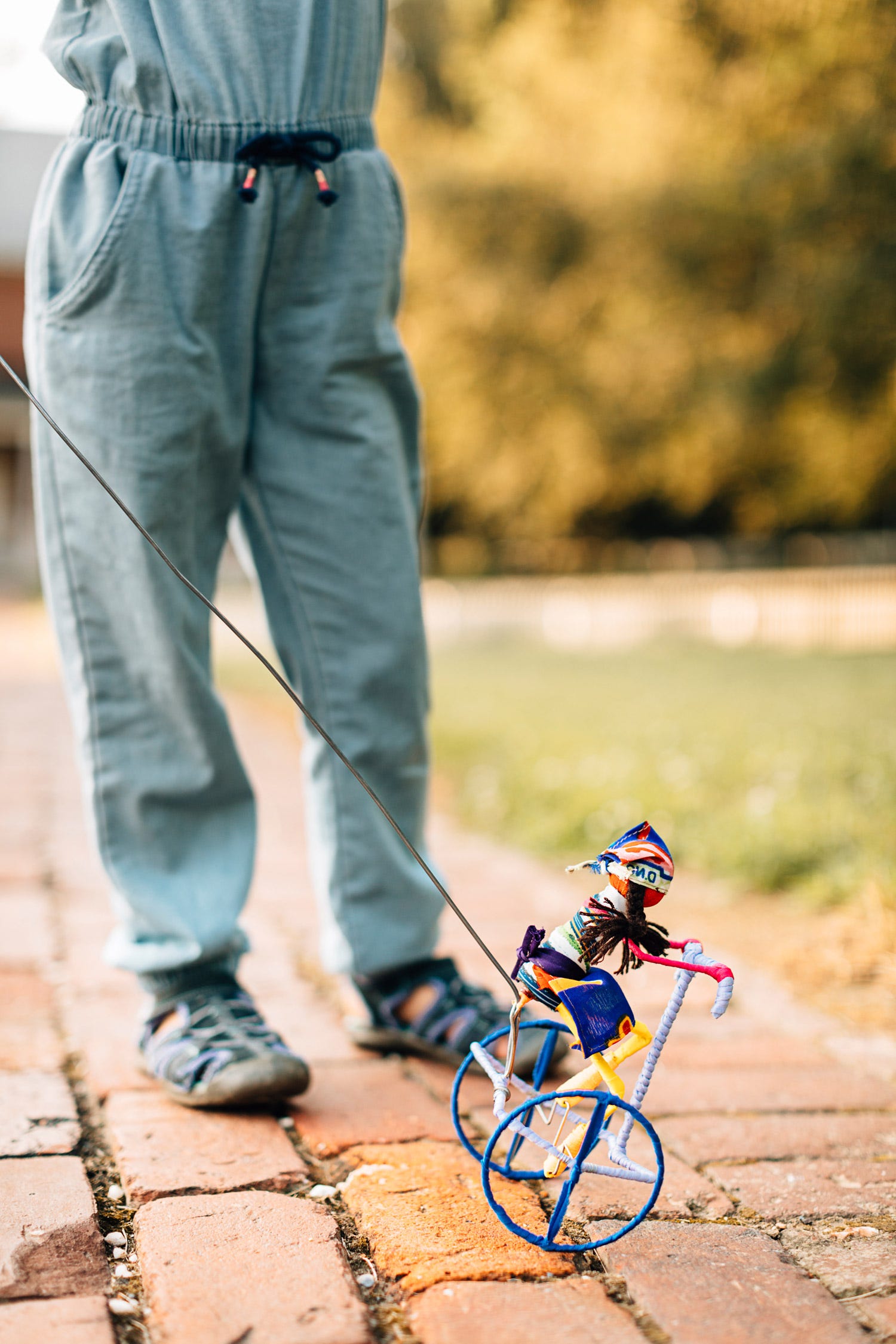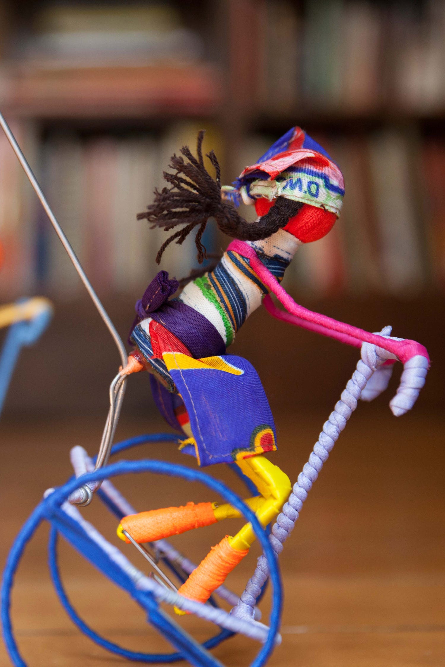 In Africa, children make galimotos out of anything from sticks to cornstalks. Galimotos can be vehicles of any sort. This bicycling girl is made from cloth-wrapped wire. Watch the rider's legs "pedal" as the wheels move. Created by artisans of the Chuma Wires workshop based in the Dandora area of Nairobi, Kenya. Chuma Wires provides valuable work for artisans who have little or no other opportunities for employment in this marginal section of Kenya's sprawling capital.