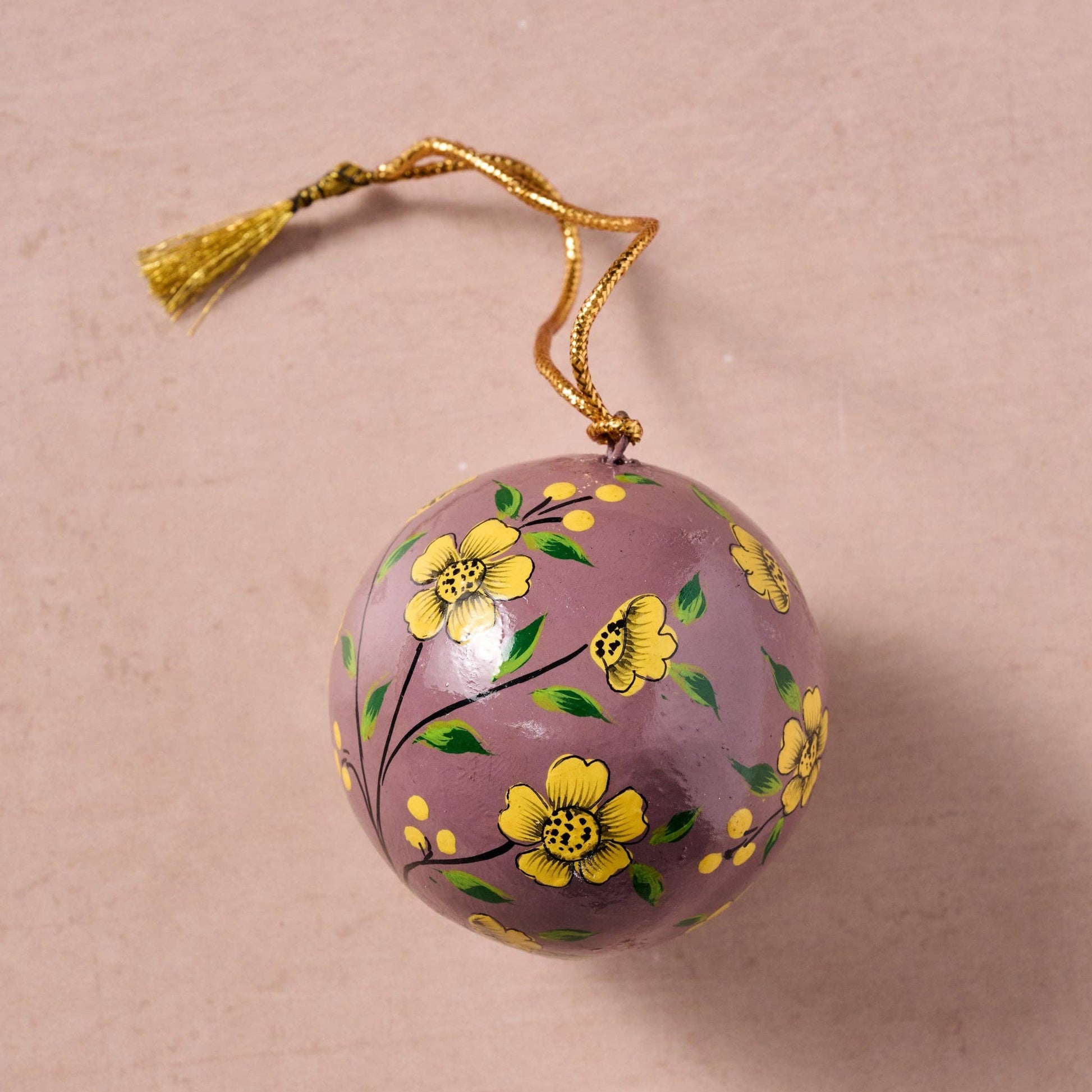 Add a splash of vibrant tradition to your décor with this handcrafted paper mâché ornament. Featuring a rich purple base adorned with a lively yellow floral design encircling the sphere, each piece is a celebration of color and craftsmanship. Lightweight yet eye-catching, it hangs elegantly by a gold string, making it perfect for brightening a holiday tree or adding a global touch to your home year-round. Hand-painted and made with care, no two are exactly alike. A Ten Thousand Villages Exclusive handcrafted in India.