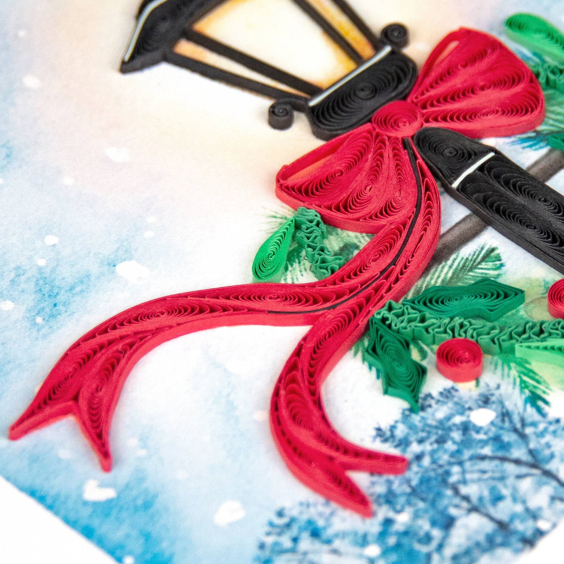 Long walks on crisp holiday nights and the feeling of excitement with Christmas in the air. Send that feeling to your loved ones this holiday season! A quilled lamp post wrapped with a red bow and holly berries and a starry night sky in the background adorns the front of this card.