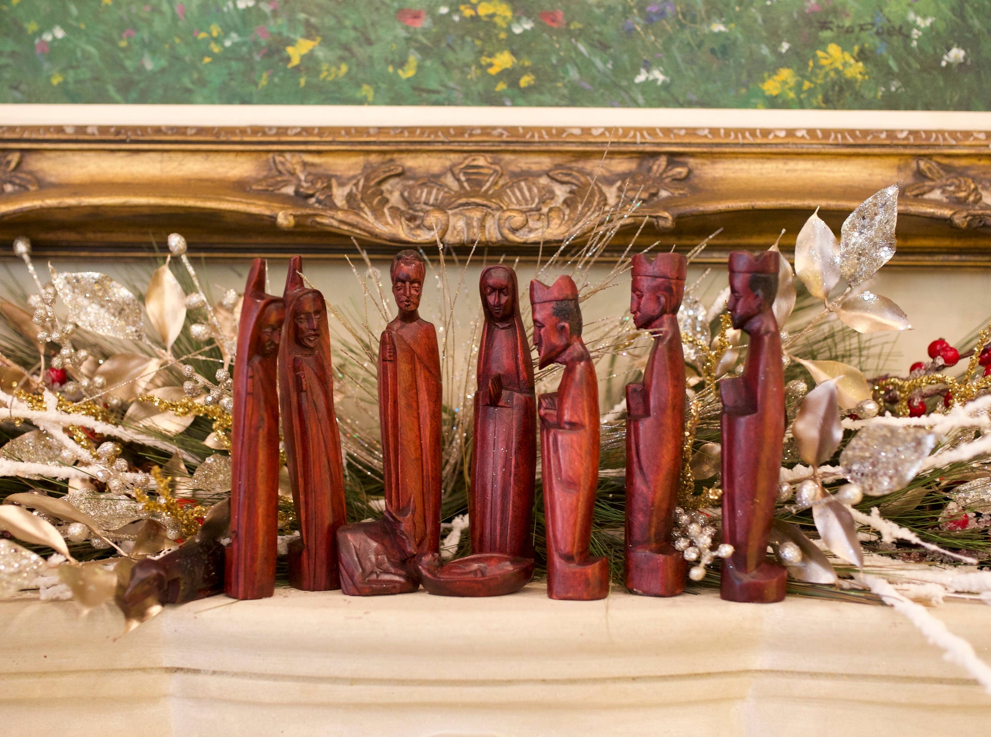 A one of a kind Christmas scene! Our Jacaranda Nativity is hand-carved by artisans in Kenya, East Africa using locally sourced jacaranda wood. Set includes ten individual figures (Joseph, Mary, baby Jesus, 3 wisemen, 2 shepherd, a cow, and a sheep). This special interpretation of Jesus' birth makes a meaningful gift and will hold a treasured place in any collection. Dimensions: 8" high x 1.5" wide