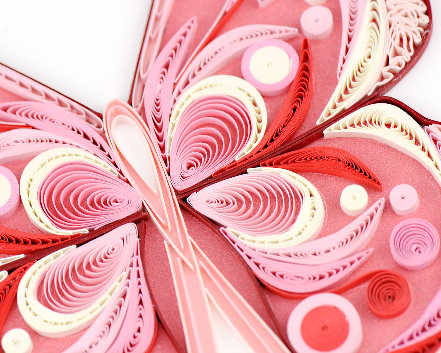 Celebrate life and support a noble cause with this handcrafted Joy to Life Pink Butterfly card. By purchasing this quilled design 20% will directly support the Joy to Life Foundation. The card features a large pink butterfly with the body being a pink breast cancer ribbon and the wings including light and dark pink abstract swirls and shapes.