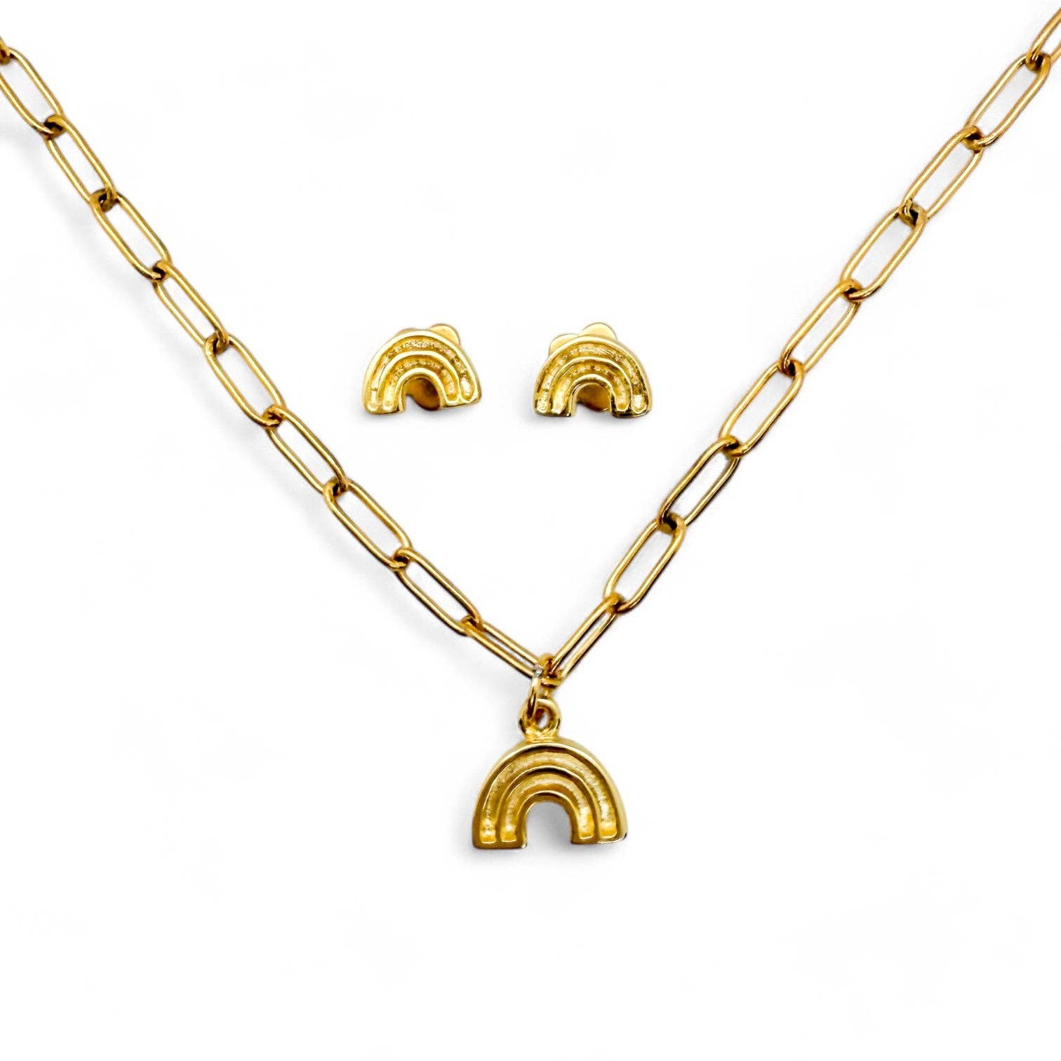 This playful and charming kid's coordinating necklace and earring set is the perfect addition to any outfit. With a stunning 14K Gold plated paperclip chain, rainbow pendant, and micro studs in the shape of rainbows, this set exudes hope, magic, and endless possibilities! Their water resistant and PVD coating ensures comfort and durability for all seasons. Hypoallergenic so even the most sensitive ears are sure to shine!