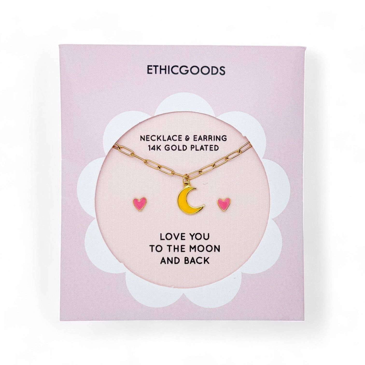 Surprise your little one with this adorable Kid's Necklace and Earring Set! Featuring a "Love You to the Moon and Back" message, this coordinating set includes heart-shaped earrings and a paperclip pendant necklace with a moon charm. With 14K Gold plating and hypoallergenic materials, it's water-resistant and safe for sensitive skin.