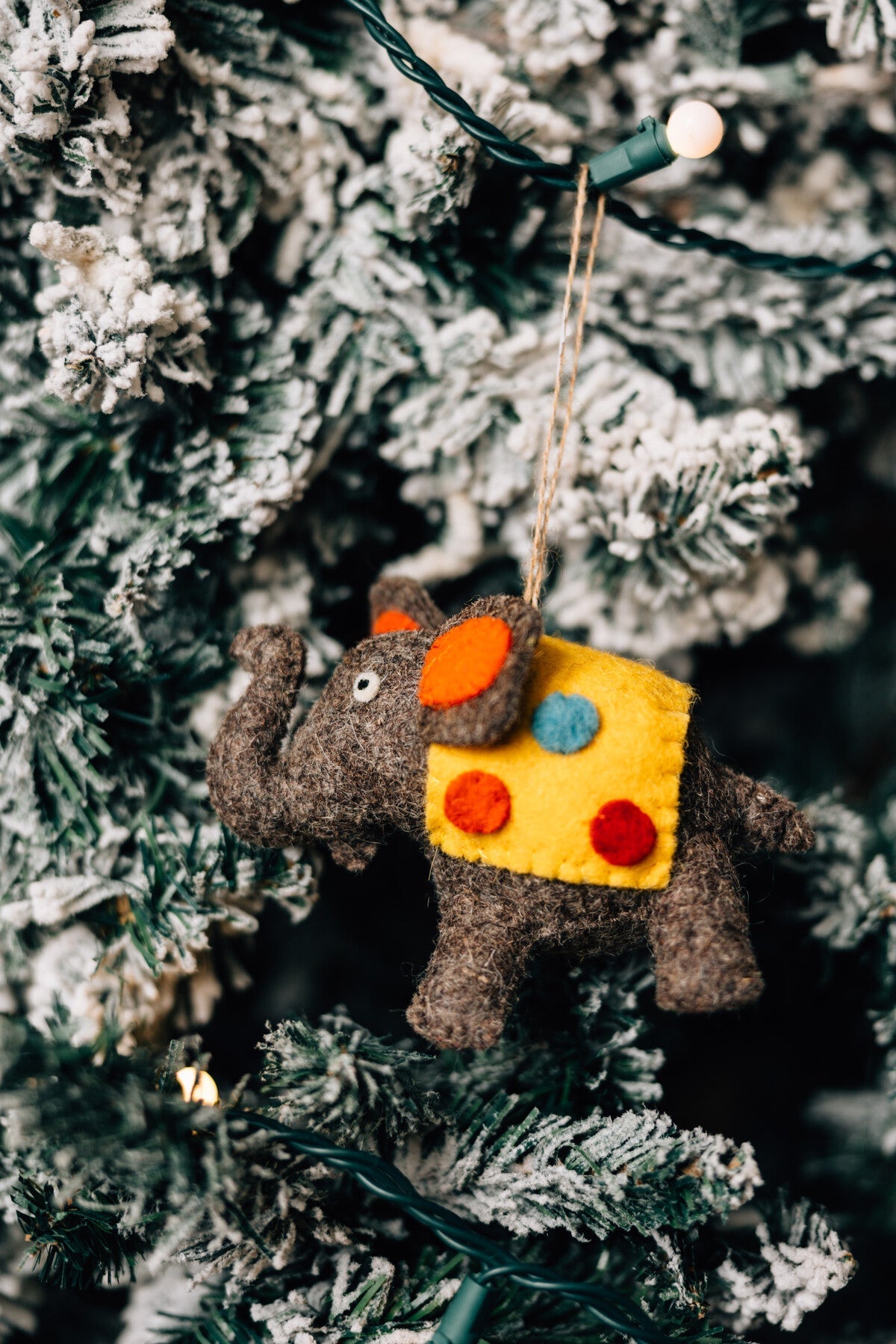 Playfully sweet, hang the Lucky Felted Elephant Ornament for an auspicious holiday. Handcrafted in India, where some believe elephants with their trunks turned to the sky is a symbol of luck! Bring that home for the holidays this year and every year.