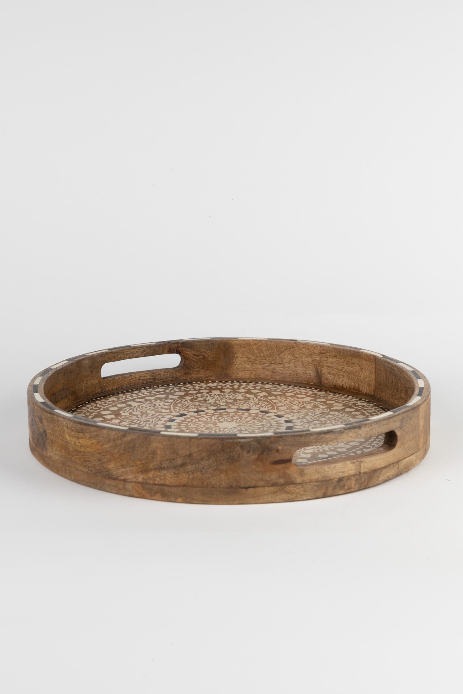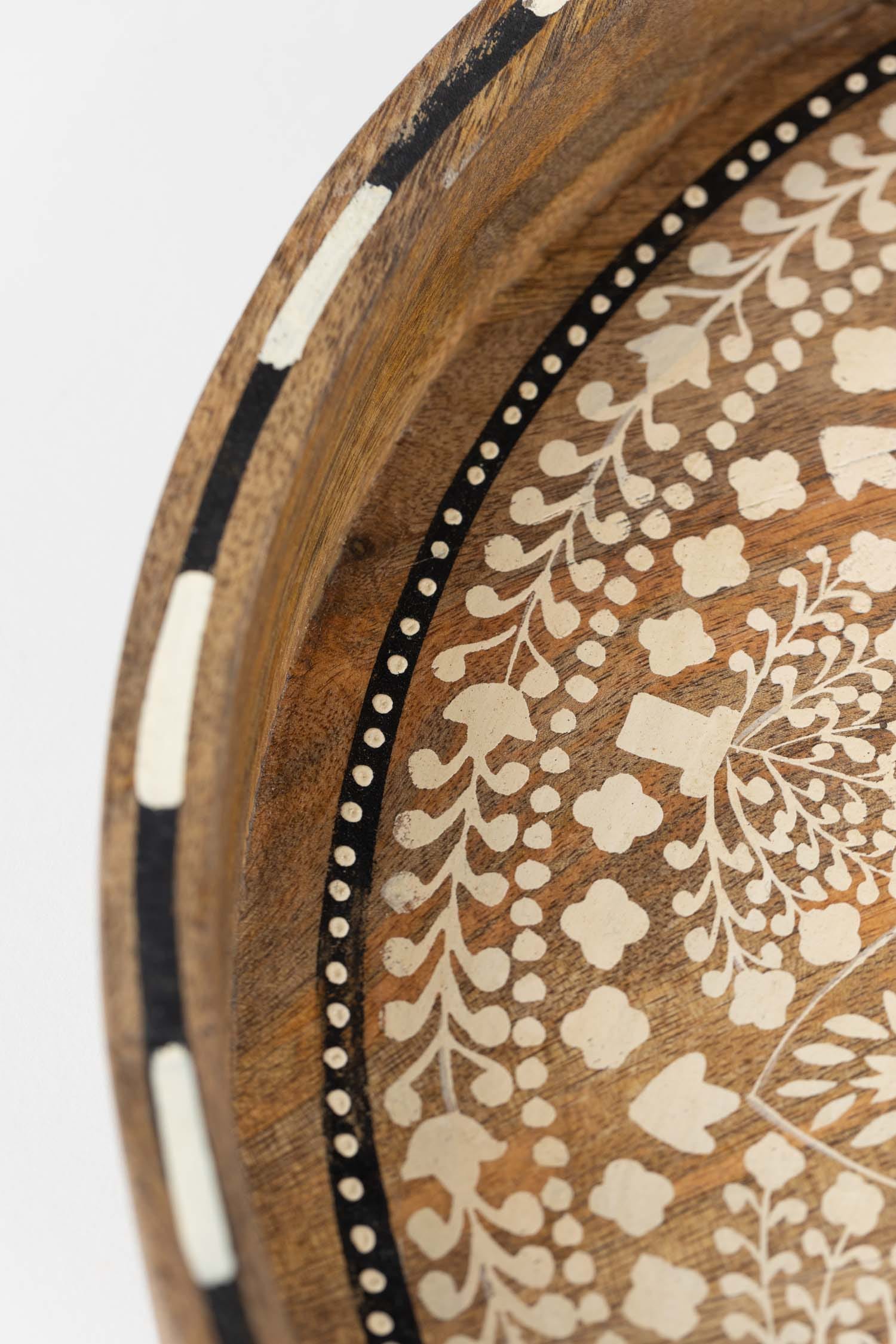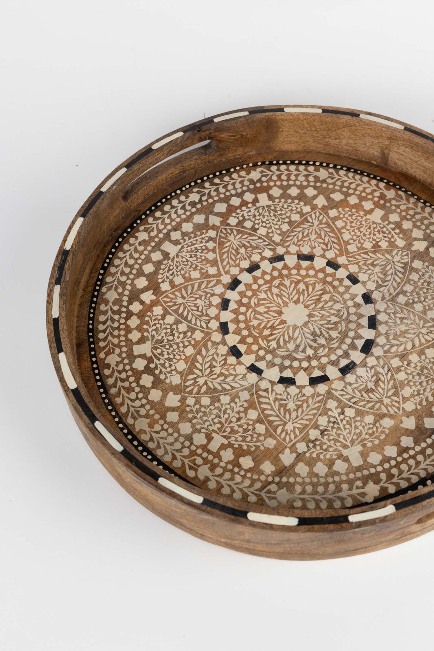 Tray hand painted mandala mango 15Dx2H brn/wht/blk