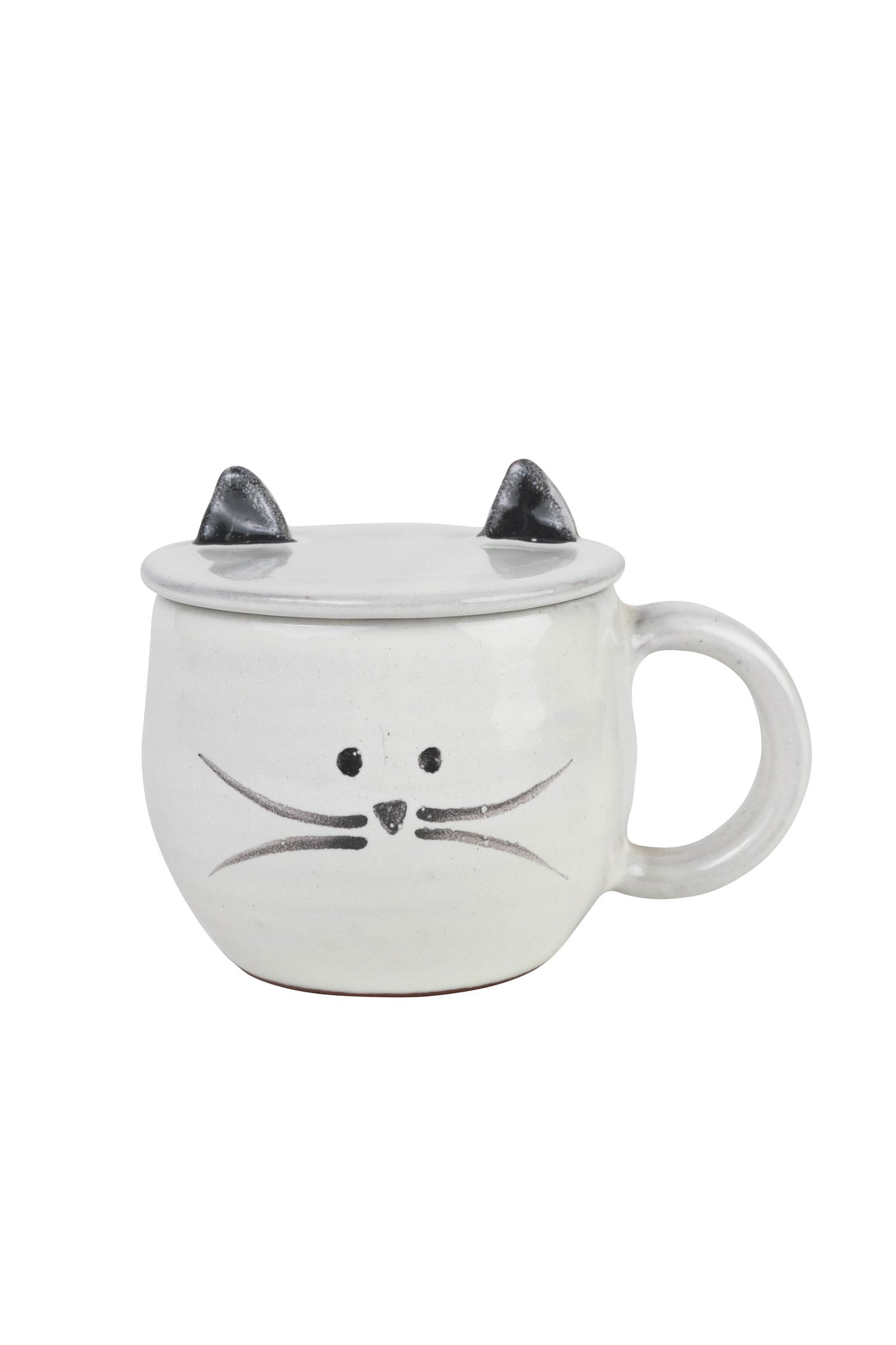 The Meow Mug is an engobe ceramic piece featuring a removable lid with kitty ears for steeping tea and a meowy cute cat face on the front. Handcrafted by fair trade artisans in Nepal.