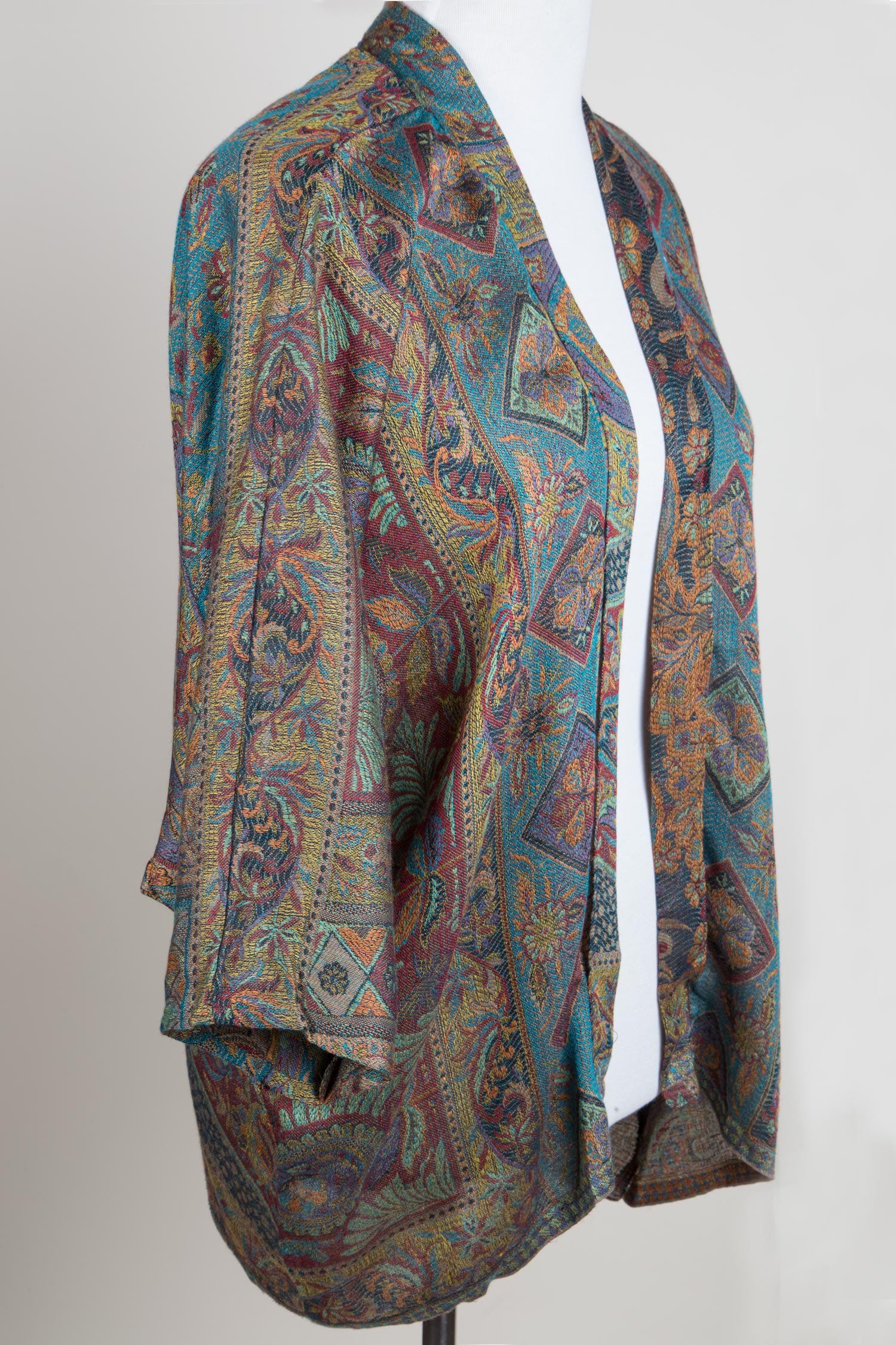 Wrap yourself up in the stunning Modern Journey Kimono. This jacquard kimono is handmade by artisans working with CRC (or Craft Resource Center) in Kolkata, India. CRC is committed to using only environmentally friendly methods and materials while developing self-sufficiency for a vulnerable segment of society through traditional handcrafting skills.