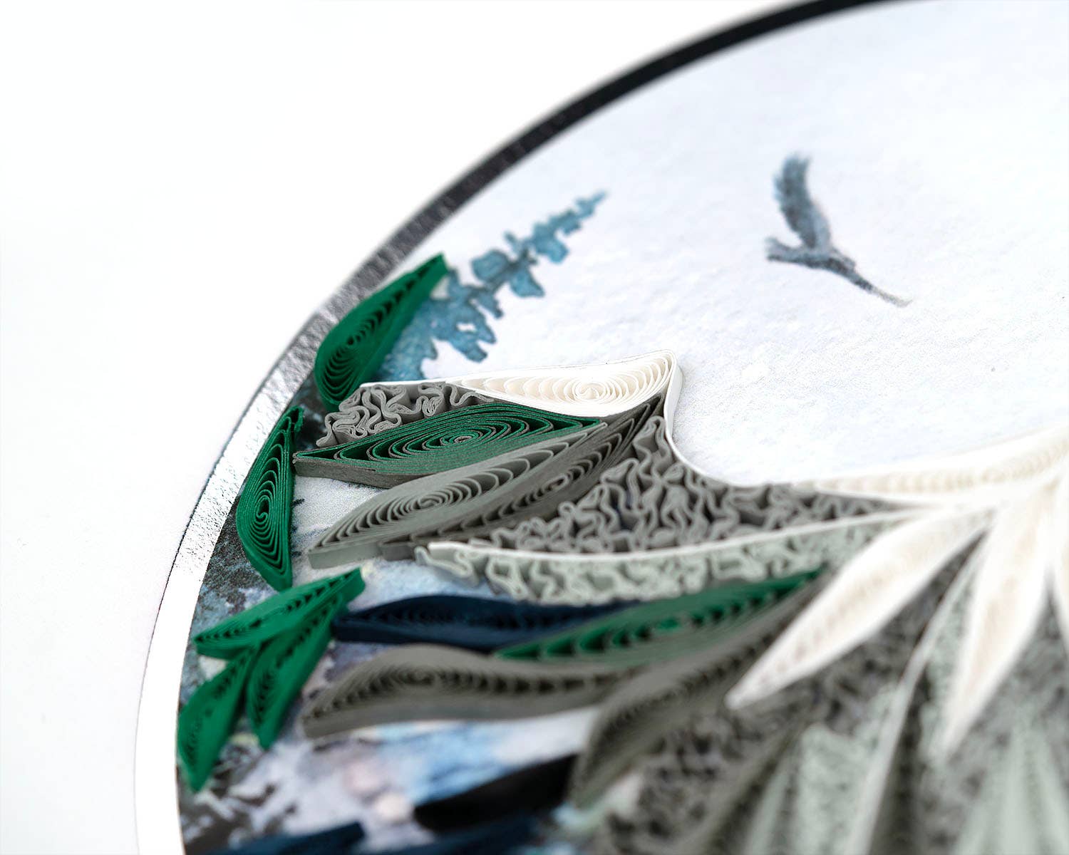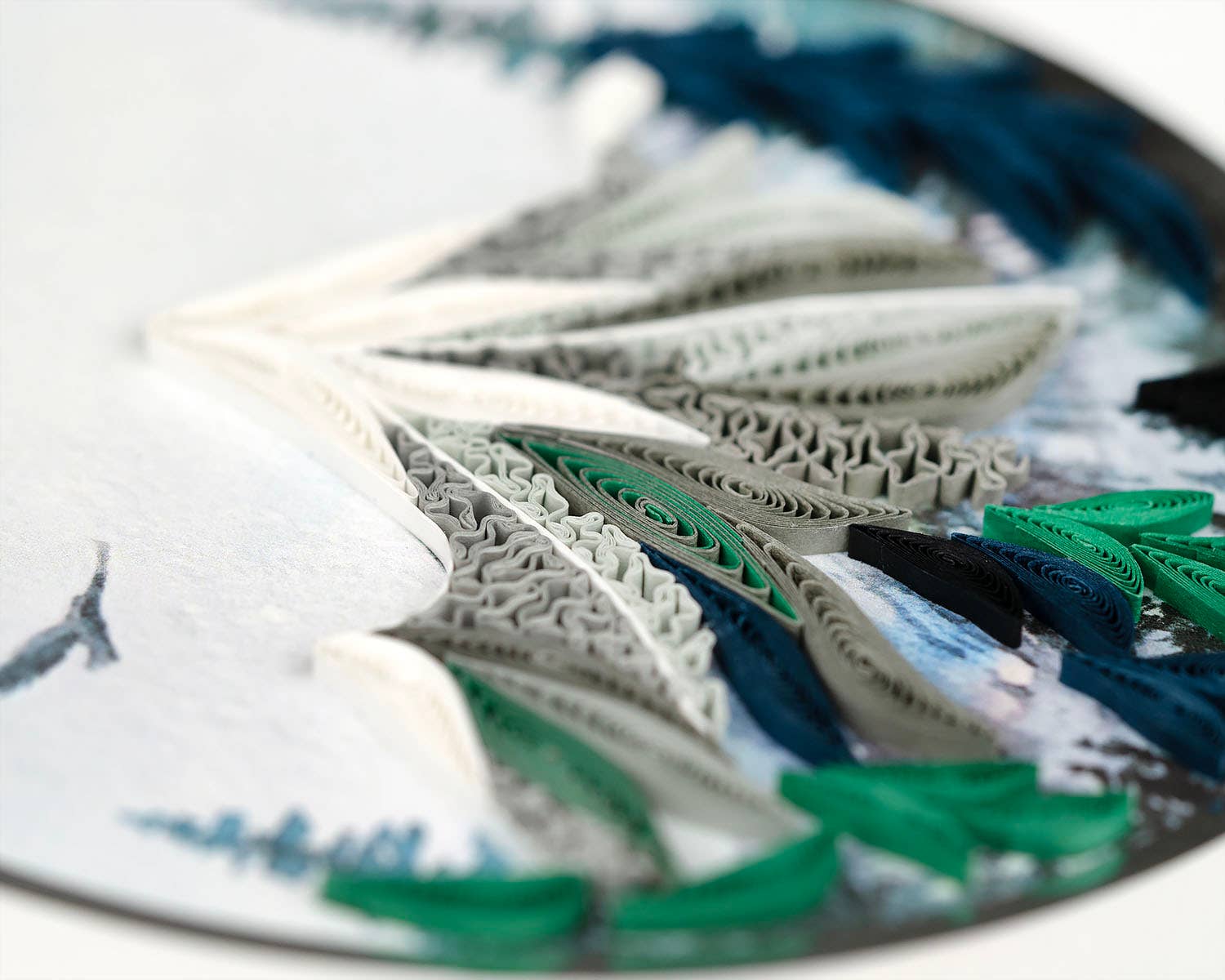 Celebrate the creation of snow filled memories with this handcrafted mountain peak greeting card. This beautiful quilled snowy mountain top is highlighted by the silver embossed circle. This card would be ideal for a a winter sport lover or anyone you think is "tops".
