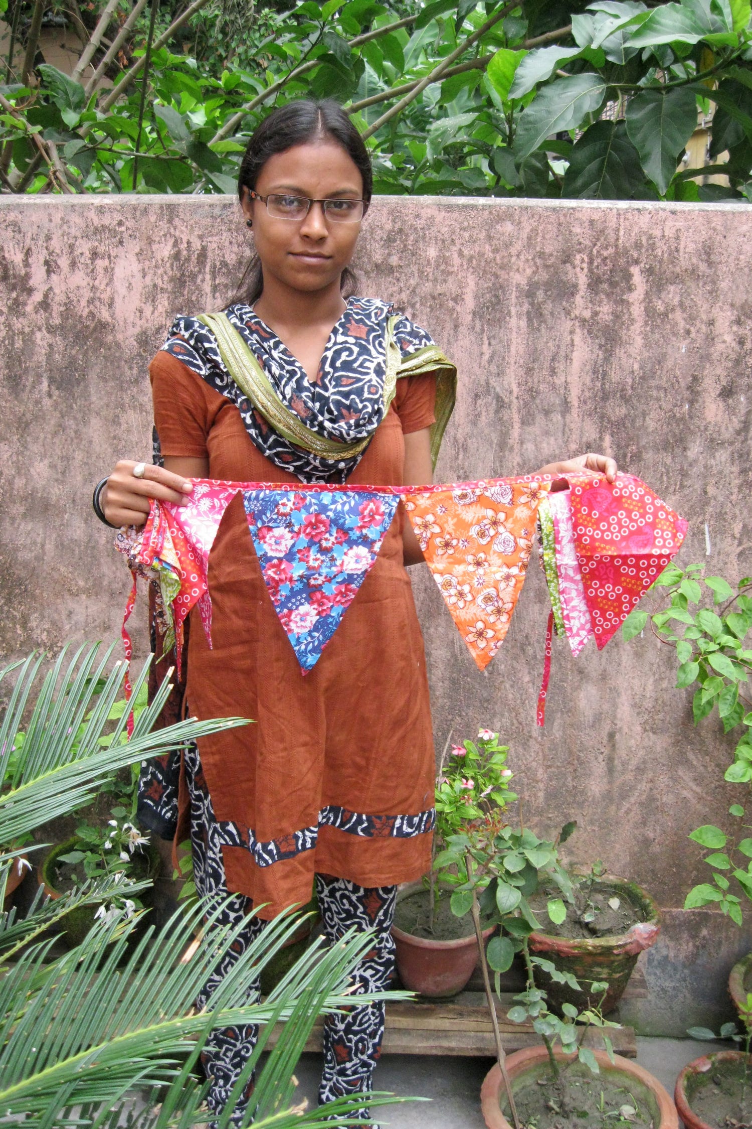 Ashirwad works to bring gender equality to Kolkata. One of the artisans who makes this garland is Bharati Mitra. She says, "I owe my gratitude to Fair Trade which has helped me breathe without the fear of oppression, exploitation and apprehension. I wish all women in distress to keep their heads high and keep on with the battle of survival."