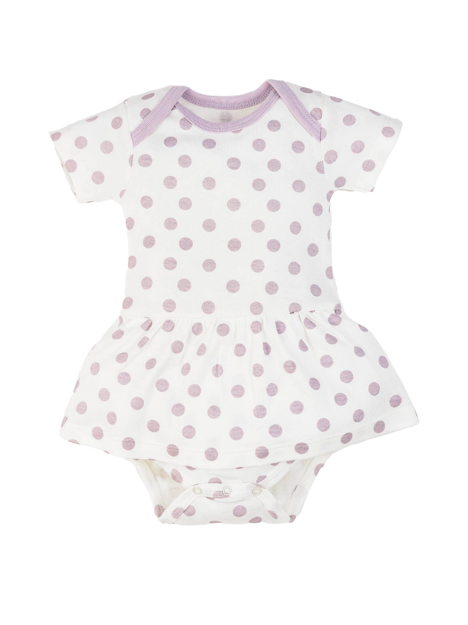 This sweet organic cotton dress bodysuit in our new Lavender Dot collection has a snap closure for easy changes. * Snap closure and lap-shoulder neckline makes for easy changing Made of 100% organic Egyptian cotton | Certified by GOTS Global Organic Textile Standard