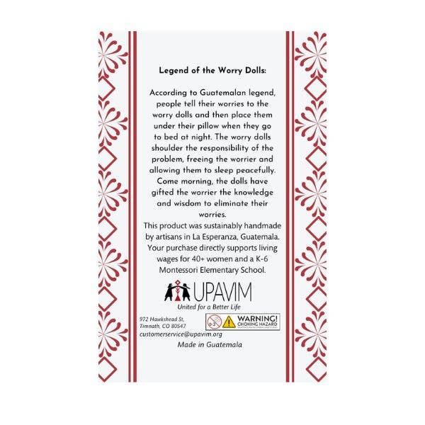 Meet our Pocket Worry Doll: your tiny troubleshooter for life's everyday anxieties. Whether you're fretting over a big exam, misplaced your keys for the hundredth time, or just can't shake that nagging feeling, our Pocket Guardian is here to help, armed with the wisdom of Mayan tradition. Each Pocket Guardian comes on a vibrant card, showcasing the doll on the front and sharing the story of the Guatemalan worry dolls on the back. Whisper your worries to this miniature marvel before bed, place it under your pillow, and let it work its magic overnight. By morning, you'll feel lighter and ready to face the day with renewed confidence. Perfect as a thoughtful gift, a personal comfort companion, or a unique cultural keepsake.