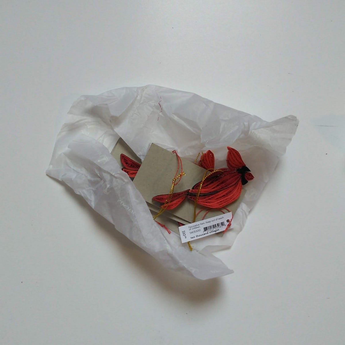 Carefully crafted of quilled paper, this stunning cardinal Christmas ornament is one-of-a-kind. Cleverly handcrafted from recycled paper in a sustainability initiative, this work of art hangs from a gold metallic string, ready to chirp in your Christmas tree.