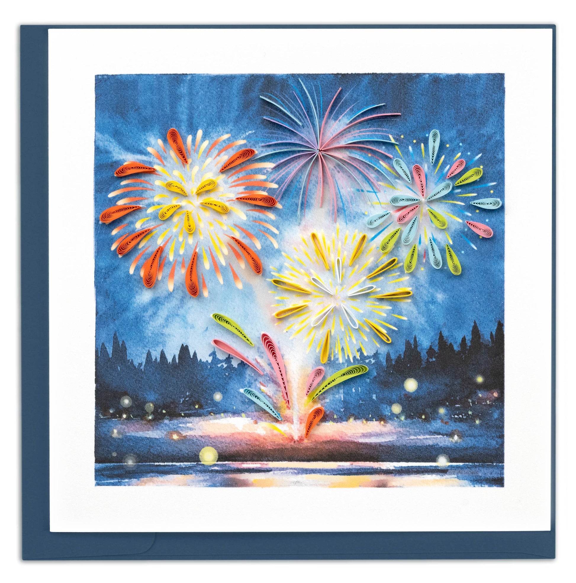 Launching into the air! The quilled fireworks are booming on a summer night sky background, beautiful watercolor to depict the moment of joy and celebration.