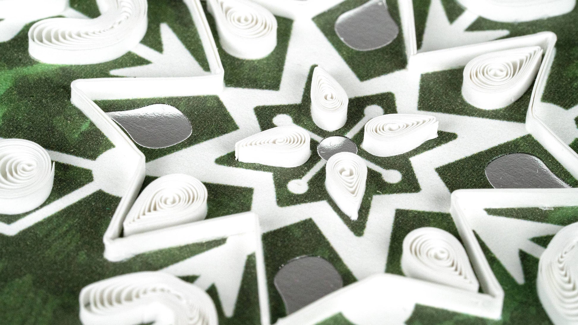 Winter symbolizes calmness and peace. It is the perfect time for reflection and sharing warm wishes. This design features an ornate, delicate snowflake on a background of deep green pine needles.