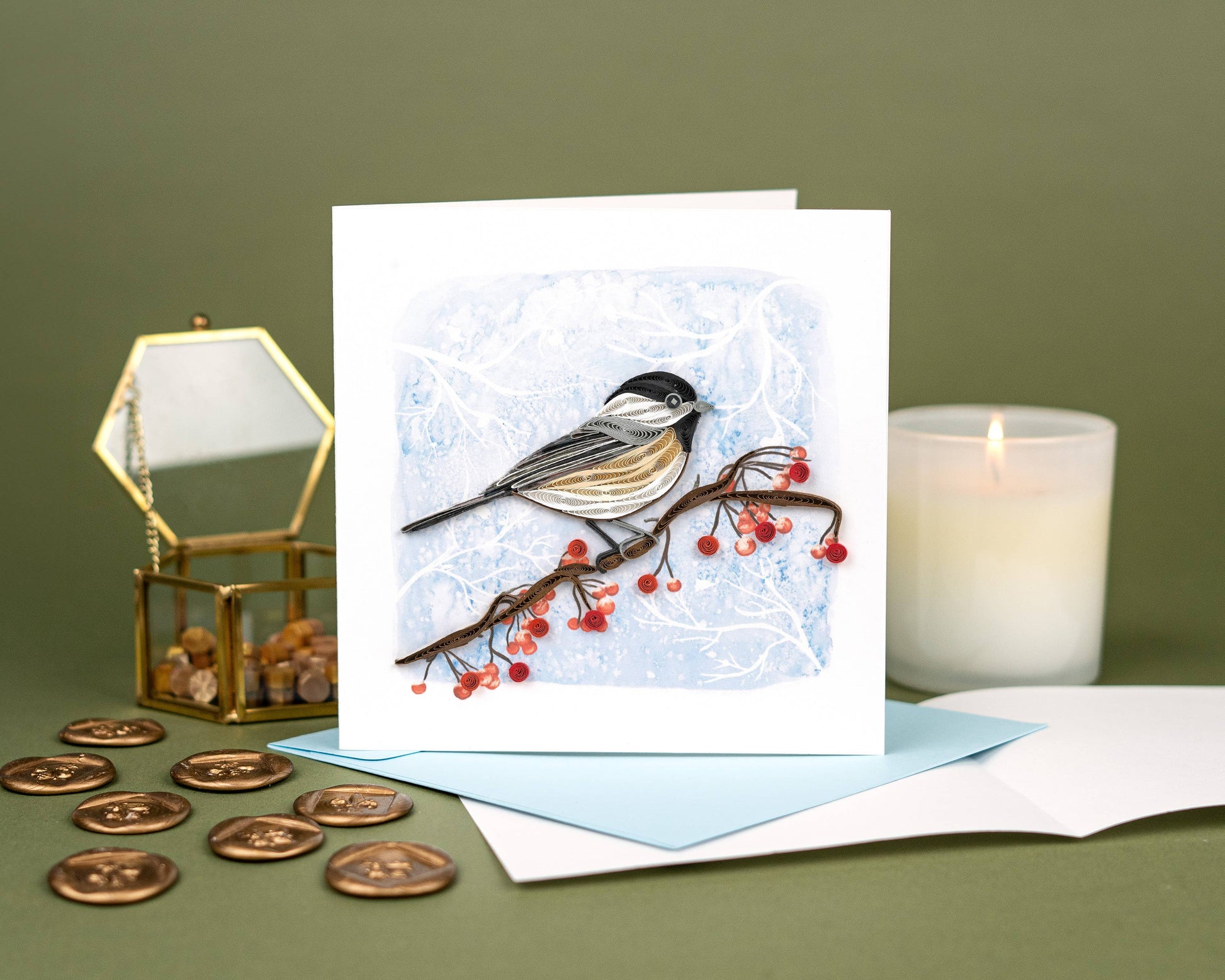 Experience the tranquil beauty of winter with our quilled Winter Chickadee card. This picturesque design showcases the Black-capped Chickadee perched gracefully on a red berry covered branch. The striking contrast of red berries against the winter background creates a heartwarming scene, making this card a truly special way to send your warmest holiday wishes.