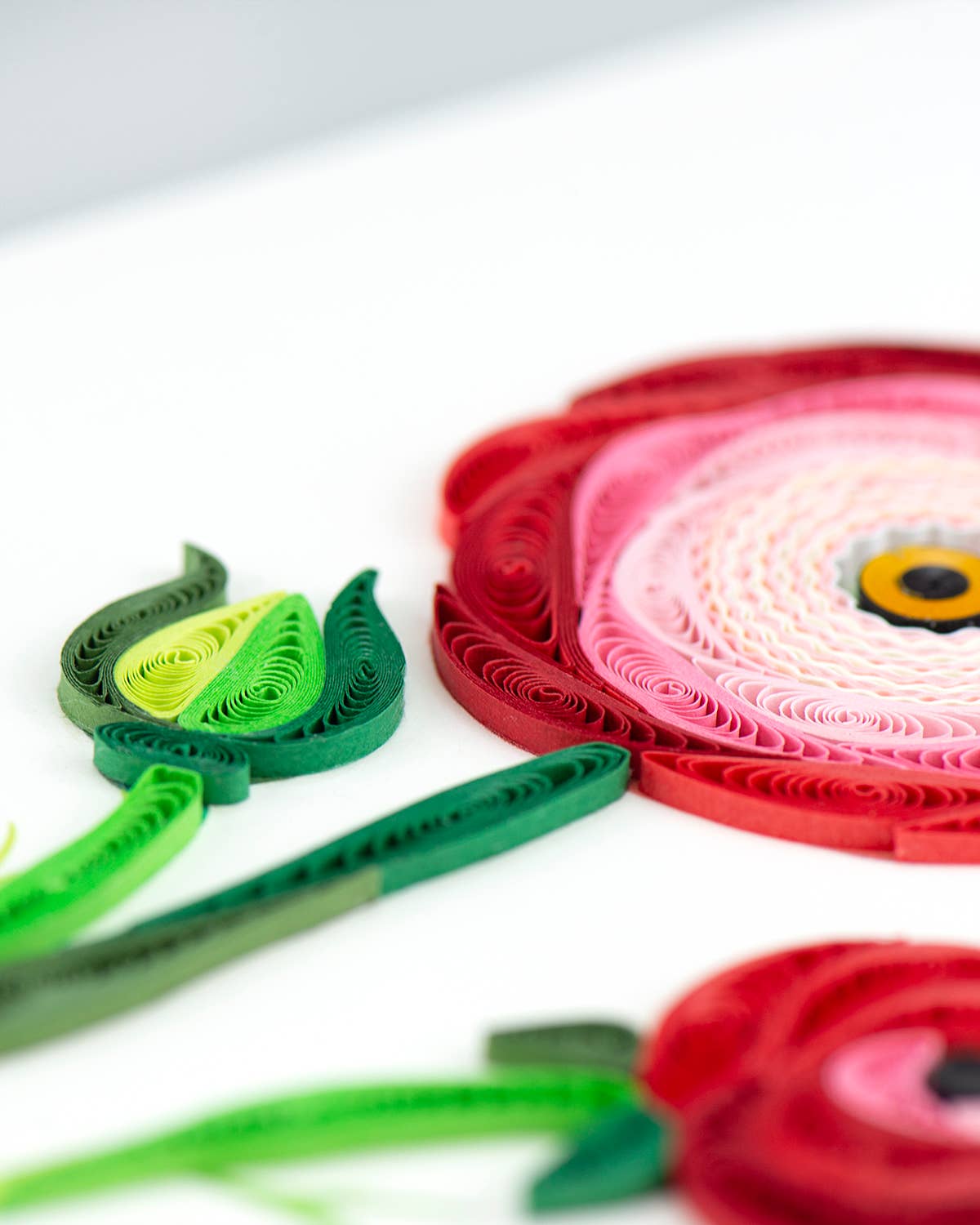 All of our cards come with a coordinating envelope, and a short history of quilling on the back of the card. Our square cards require extra postage.