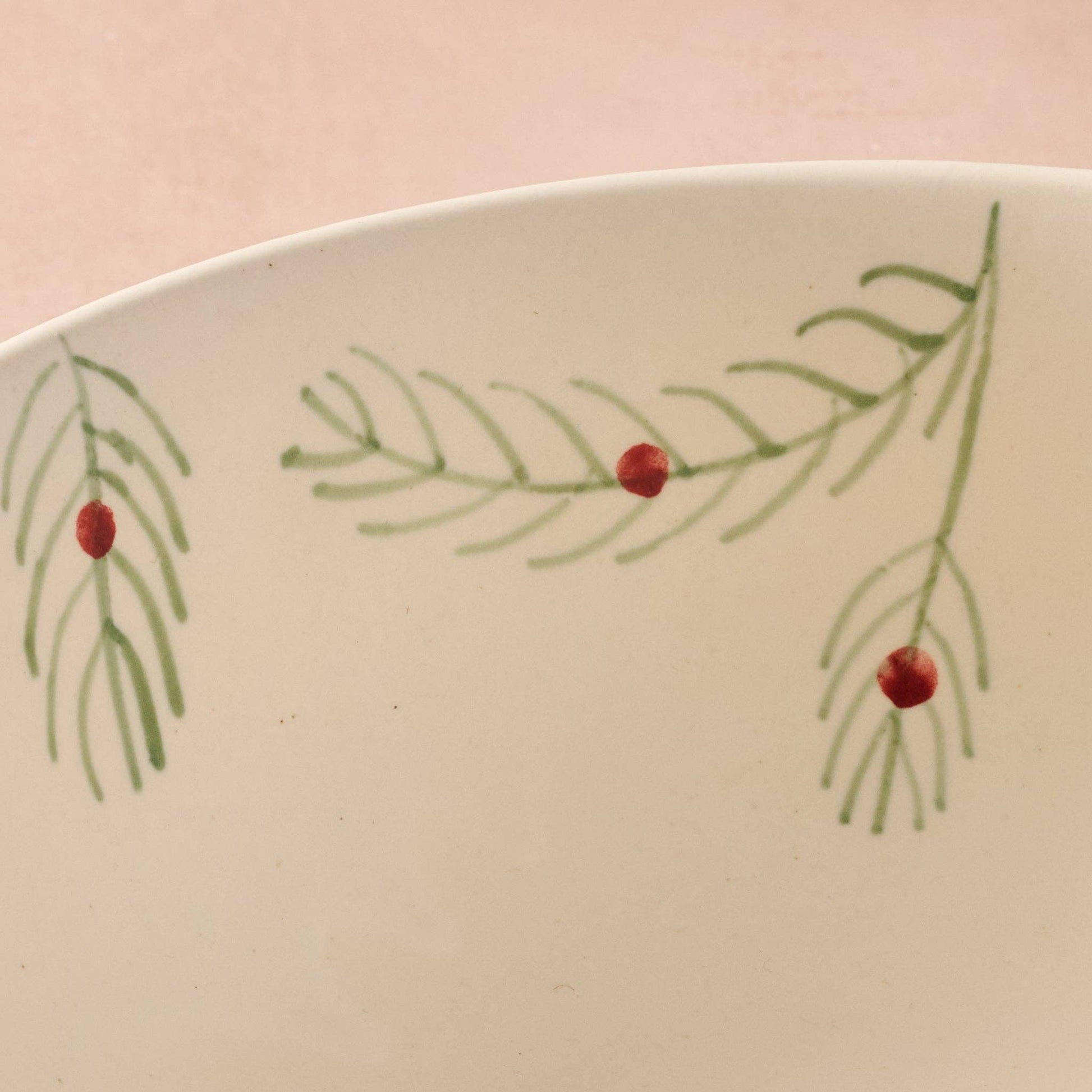 This holiday, add a festive touch to your table with this elegant ceramic serving bowl. Cream-colored with a classic holly motif in green and red around the rim, this bowl brings timeless cheer to seasonal gatherings. Generously sized for side dishes, salads or treats, it's both microwave and dishwasher safe making it as practical as it is charming. A beautiful way to serve with spirit all season long. Set your entire holiday table with style and warmth by adding the coordinating Appetizer Plate, Serving Dish and Oversized Mug. Handcrafted in India. Coordinates with 6896310, 6896320 and 6896360.