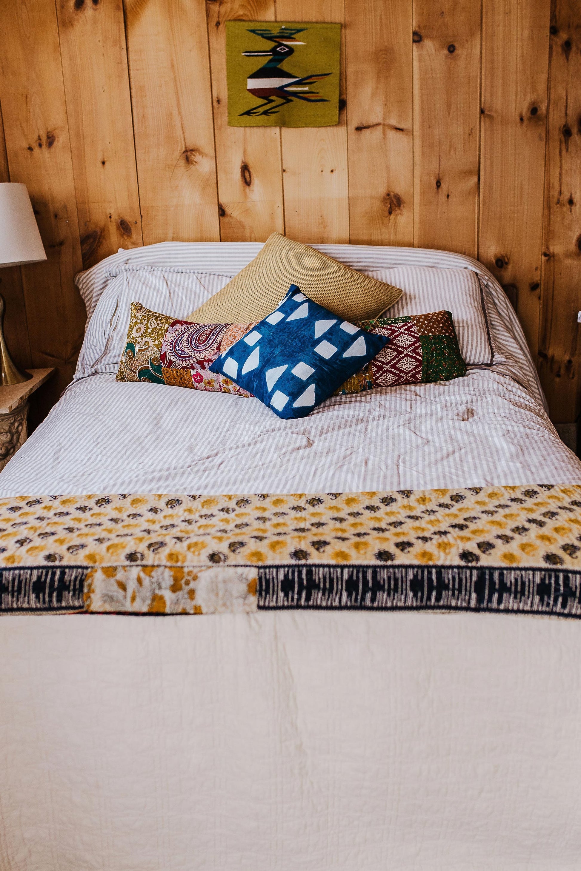 Three coconut shell buttons, on a bright patchwork throw cushion. Uniquely handcrafted from recycled sari cloth in many colors. Handmade by artisans of Sacred Mark, a workshop of artisan group Prokritee in Bangladesh. The artisans are women who have broken away from the sex trade and now make their living by making soap and handicrafts. The name "Sacred Mark" was inspired by Nobel Prize winning Bengali poet Rabindranath Tagore.