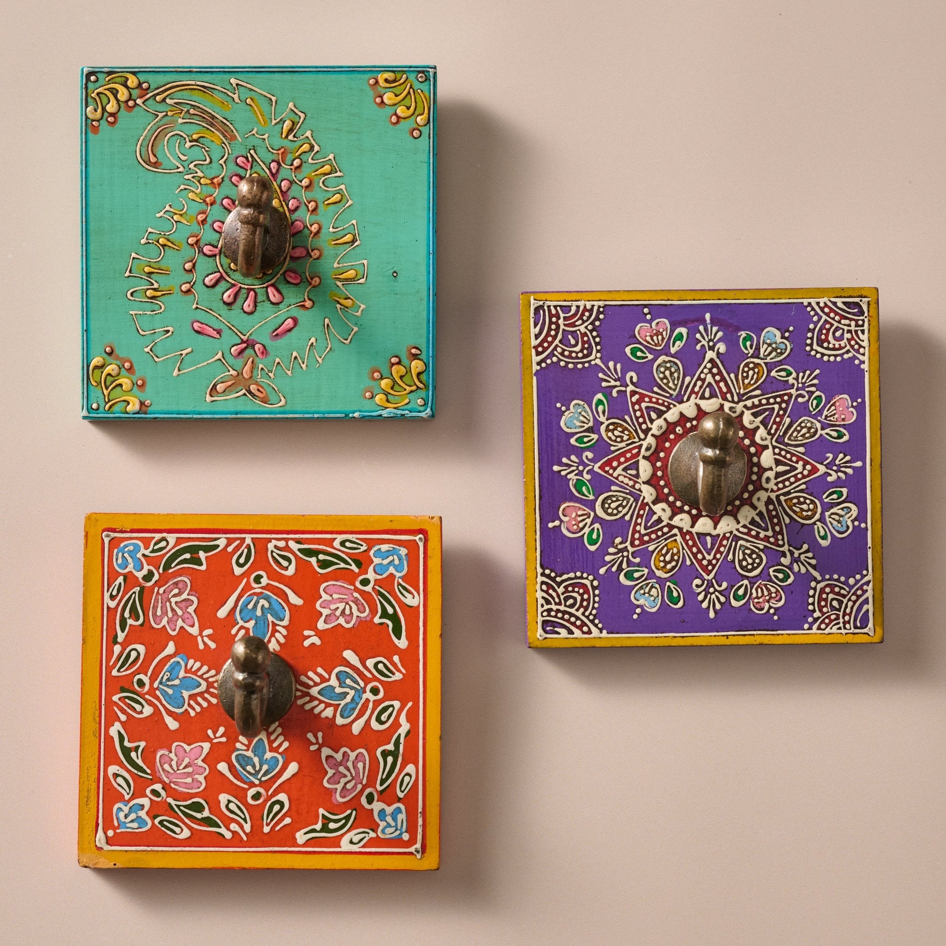 Wall hook sq leaf pntd MDF/iron 4sq teal/multi