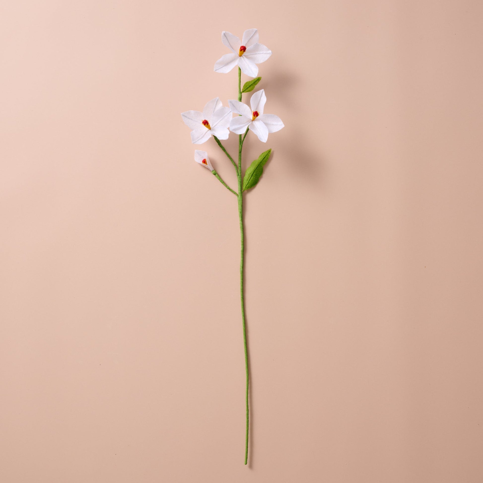 Add a fresh and natural touch to any space with these gorgeous silk paperwhite flowers. Each jute wrapped wire stem features three paperwhite flowers, one bud and a leaf. The white flowers with red and yellow centers add a classic aesthetic and are ready to be styled. A Ten Thousand Villages Exclusive handcrafted in Bangladesh.