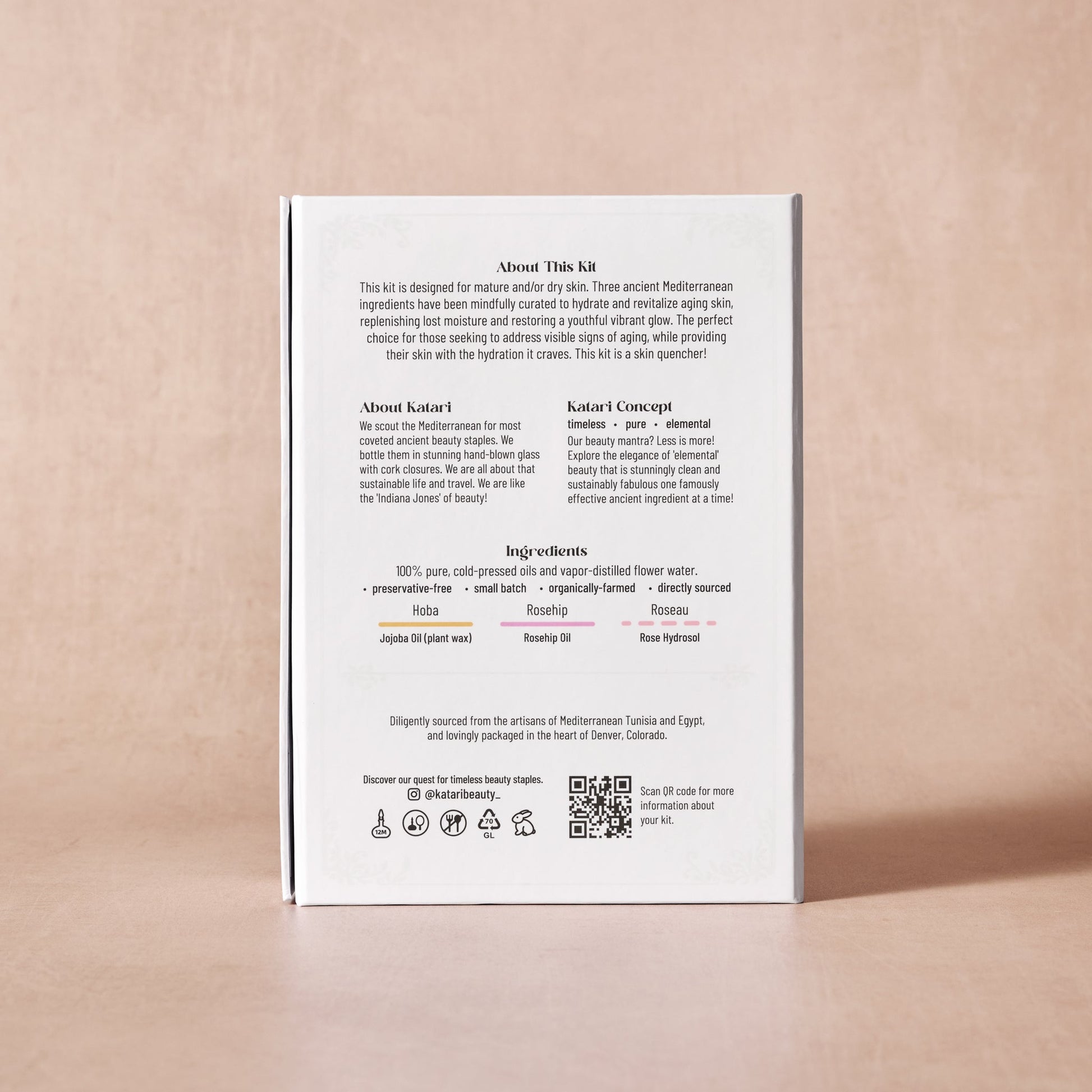 Replenish and restore your dry and mature skin with our Slow Beauty Ritual Kit. Specially curated with three ancient Mediterranean ingredients, this kit hydrates and revitalizes aging skin, giving it a youthful and vibrant glow. Say goodbye to visible signs of aging and hello to the perfect skin quencher. Kit includes cleansing Hoba oil, Rosehip oil and refreshing Roseau toner. All of the products in this kit are sourced from skilled artisans of Mediterranean Tunisia and Egypt.