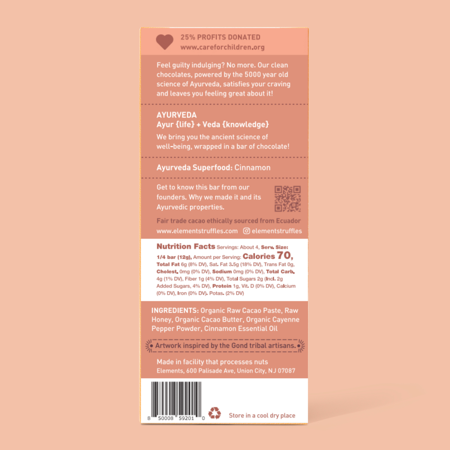 Of course, like everything else from Elements, Spicy Cayenne bar is free from dairy, refined sugar, soy, lecithin, sugar alcohols, natural flavors, gluten or absolutely anything artificial. Think of it as a treat made from two core ingredients: Organic Cacao and Raw Honey! Cinnamon and Pure Essential Oils are added for functional benefits and multi layered taste that lingers on.