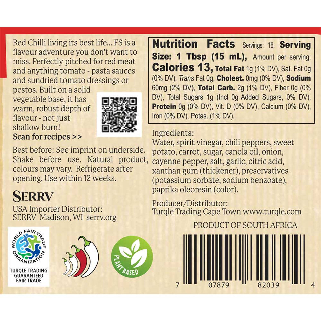 Fire Sauce: Water, spirit vinegar, chili peppers, sweet potato, carrot, sugar, canola oil, onion, cayenne pepper, salt, garlic, citric acid, xanthan gum (thickener), preservatives (potassium sorbate, sodium benzoate), paprika oleoresin (color).