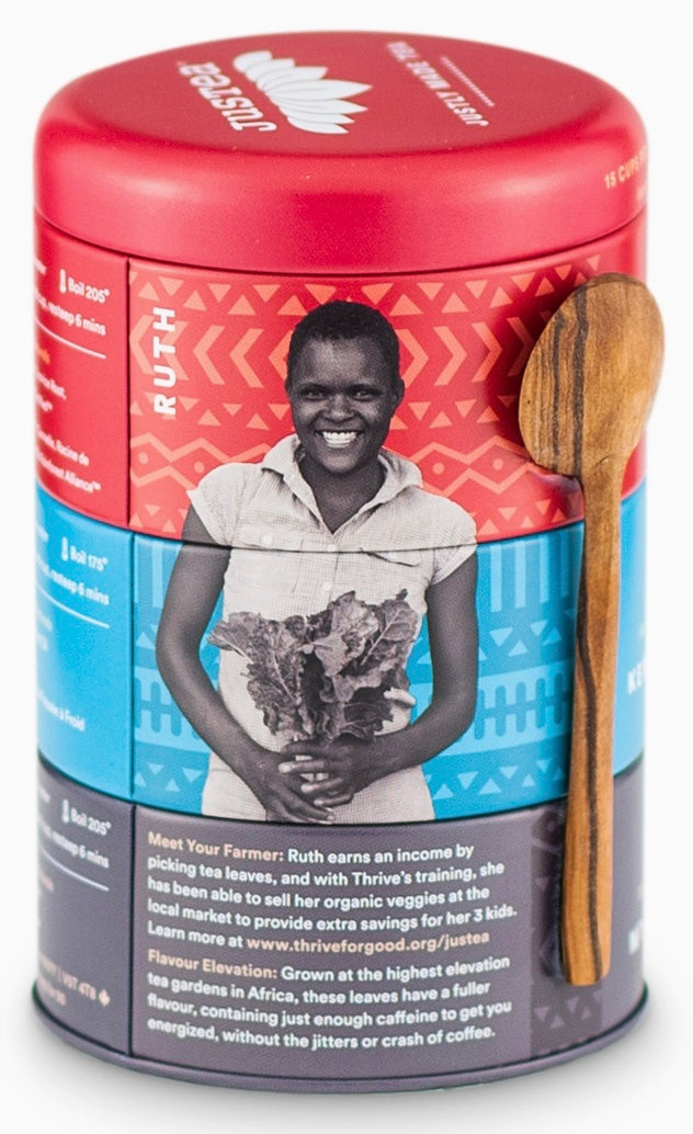 HAND-CARVED SPOON: Attached to each tin is a handcrafted, olive-wood tea spoon! Creating sustainable employment for Kenyan artisans.