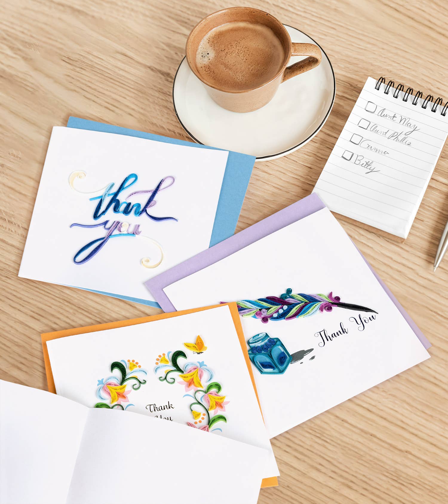 All of our cards come with a coordinating envelope, and a short history of quilling on the back of the card. Our square cards require extra postage.