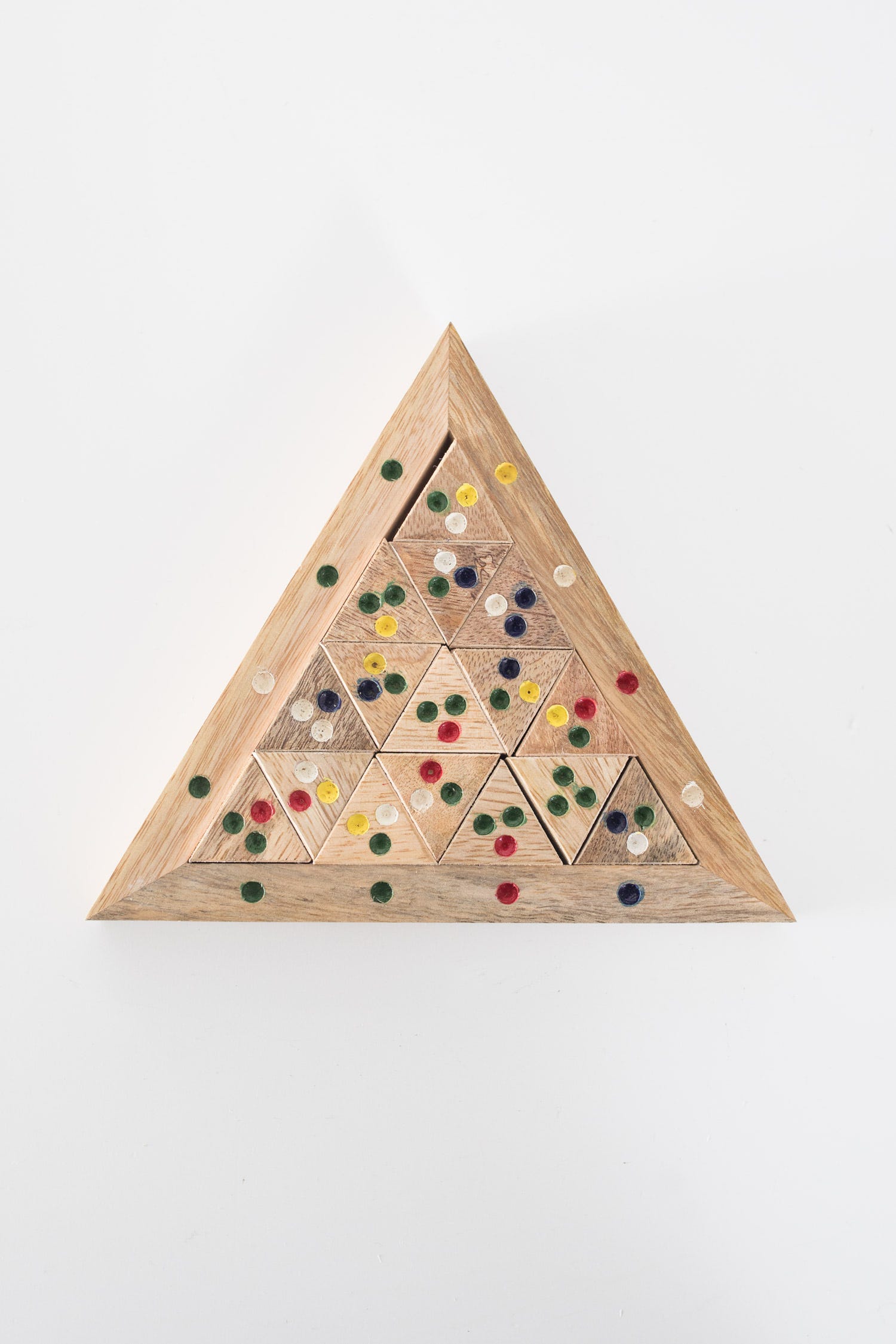 The Triangle Puzzle Game will provide entertainment for kids (or adults!) at your next family gathering. This game is lovingly crafted by artisans of the Asha Handicrafts Association. Sanskrit for "hope," Asha provides opportunities for artisans in and around Mumbai.