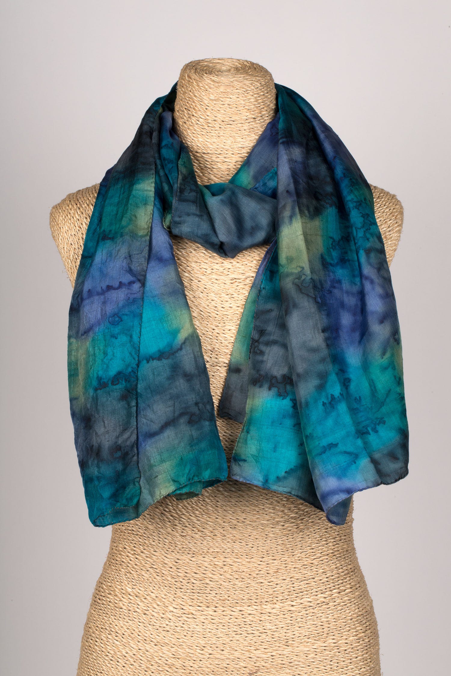 Imagine the ripple of water in a stream, translated to a gorgeous hand-painted silk scarf. Painted silk scarf in peacock colors captures the beauty and peace of a rippling stream.